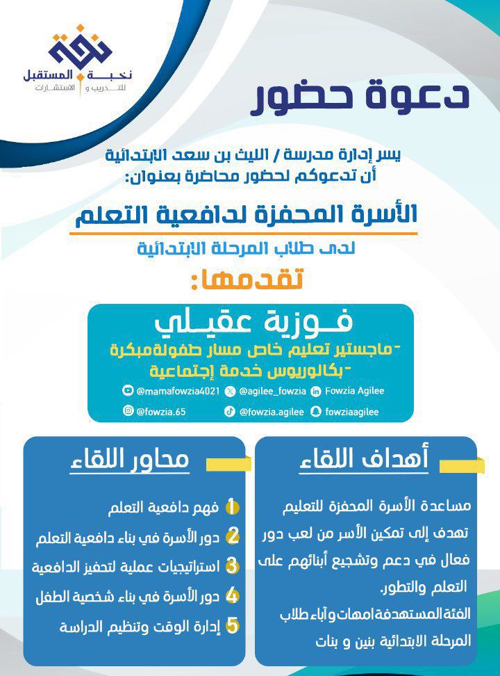في هذا الفيديو نقدم لكم تسجيل الأمسية التربوية المميزة بعنوان “الأسرة المحفزة لدافعية التعلم” استكشفوا أسرار تعزيز دافعية التعلم لدى الأبناء من خلال دور الأسرة وأثر الكلمة الإيجابية⭐