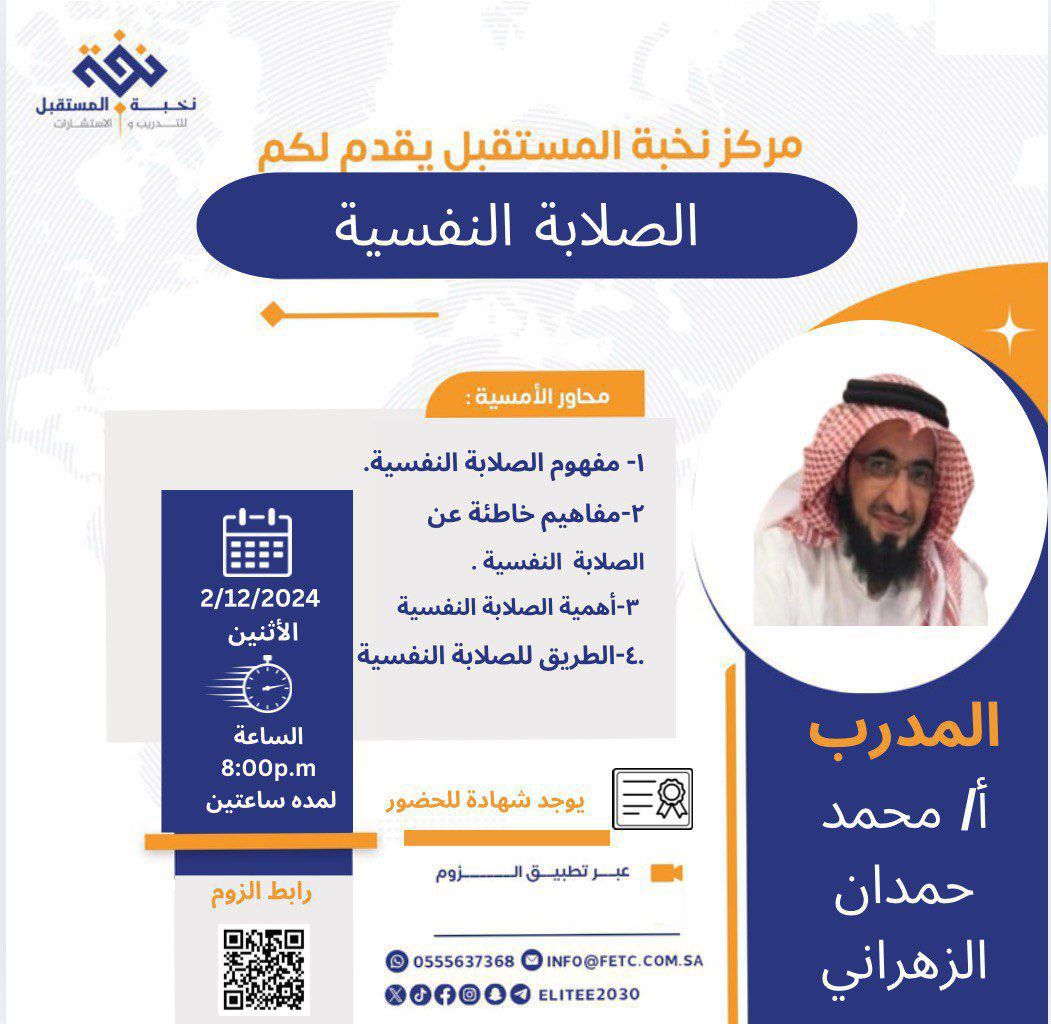 في هذه الأمسية سوف نتكشف أهمية الصلابة النفسية في حياتنا اليومية وكيف تؤثر على نجاحنا وسعادتنا ؟ شرح مفصل لأدوات عملية تساعدك على تطوير صلابتك النفسية