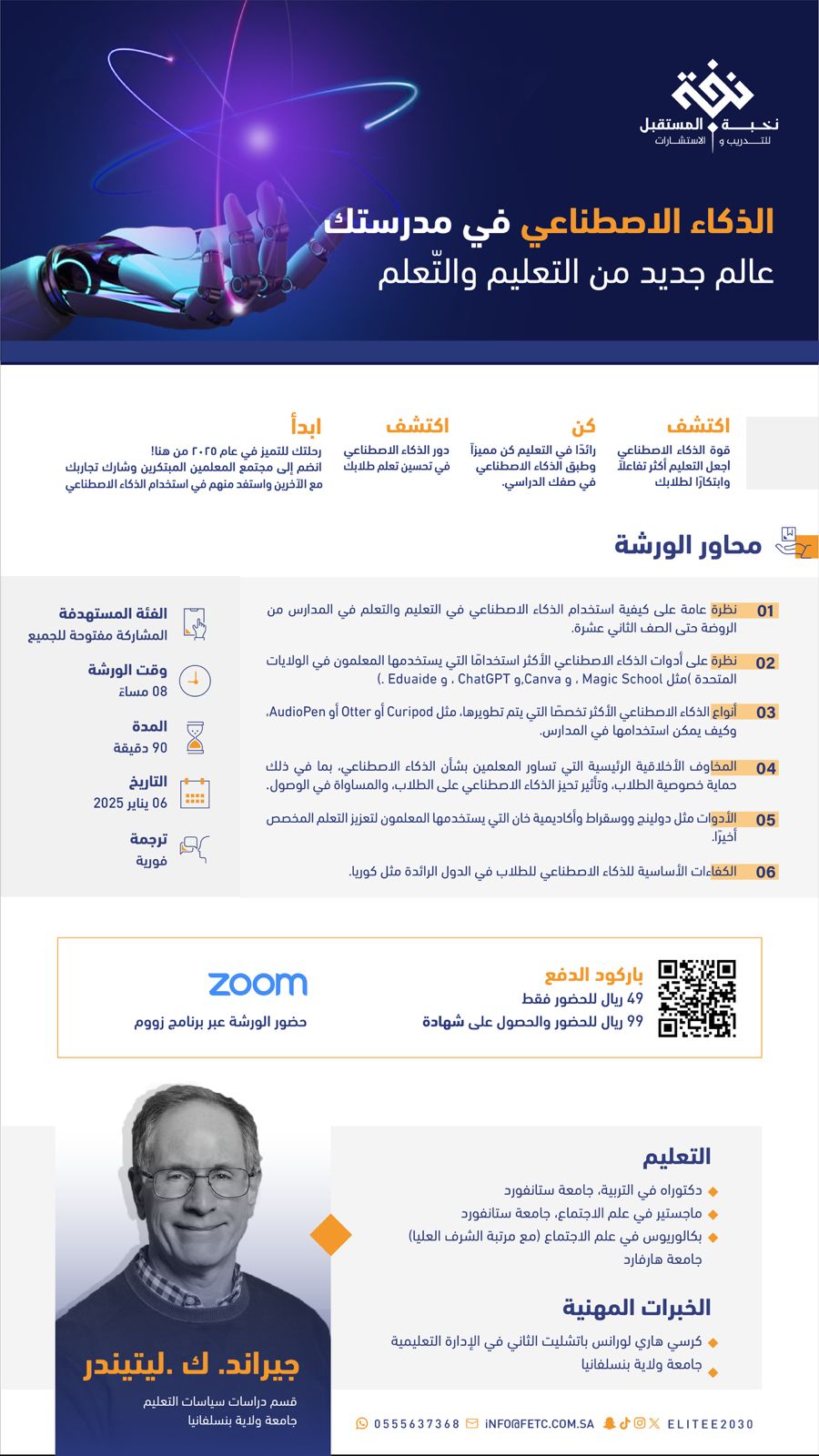 بناء على الطلبات العديدة التي وردت المركز حول الذكاء الاصطناعي في المدارس التي قدمها الخبير الامريكي (جيراند. ك .ليتيندر) ، والرغبة في ورش مماثلة للذكاء الاصطناعي يقدمها نفس الخبير الامريكي (جيراند. ك .ليتيندر) ، فقد تم الاتفاق معه على تقديم العديد من الورش المتخصصة و أولها الورشة المذكورة في الاعلان أدناه :